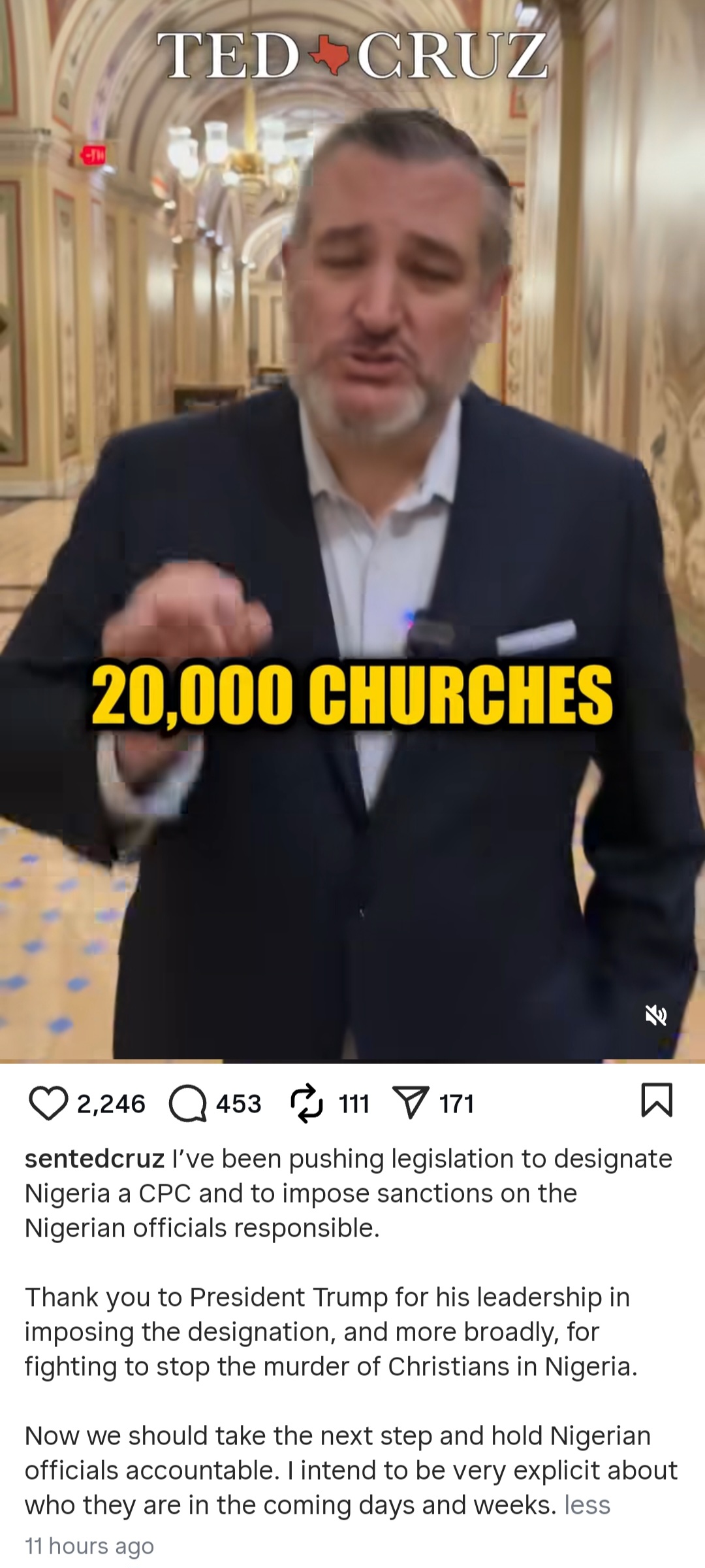 In the caption, Cruz wrote: “I’ve been pushing legislation to designate Nigeria a CPC and to impose sanctions on the Nigerian officials responsible.