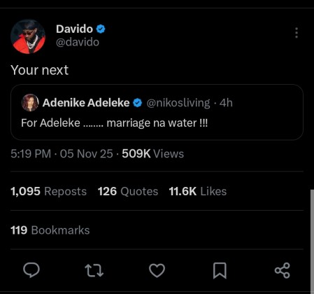 You are next to get married – Davido tells cousin AdenikeDavido quickly responded with a witty comeback, “Your next,” sparking amusement among fans who flooded the comments with laughing emojis.