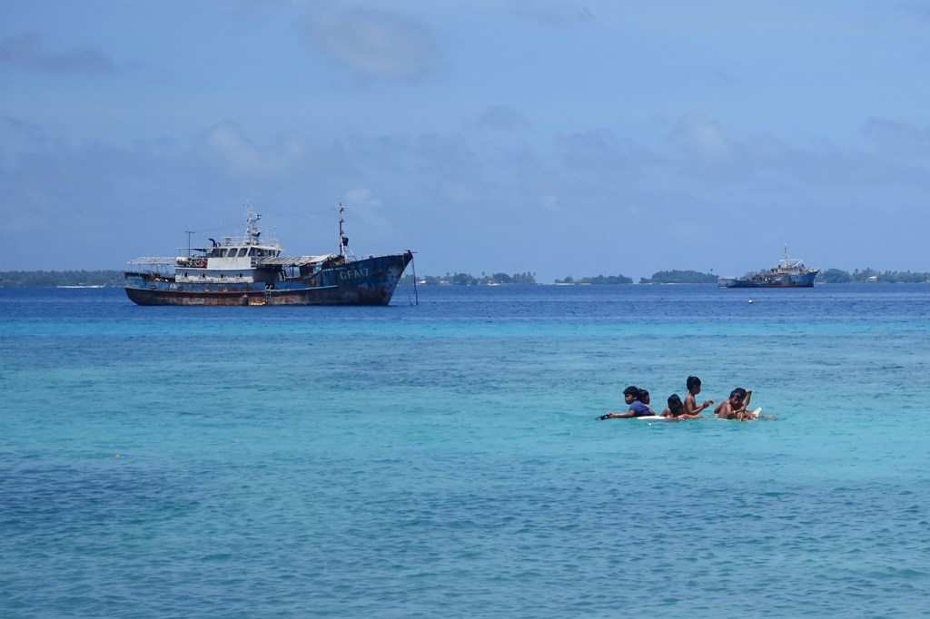On a balmy weekday morning in Majuro, young children play fearlessly in the lagoon. Young boys commandeer sheets of wood from a pile of construction debris, and use them as makeshift rafts that they row with planks, kayak-style. The boys are probably 10 to 12 years old, and as they stroke in unison on alternate sides of their improvised craft, they sing cadence in their mother tongue. The scene is a miniature echo of the paintings of Marshallese warriors in traditional canoes, arms raised in unison mid-stroke, that grace the walls of a local hotel.