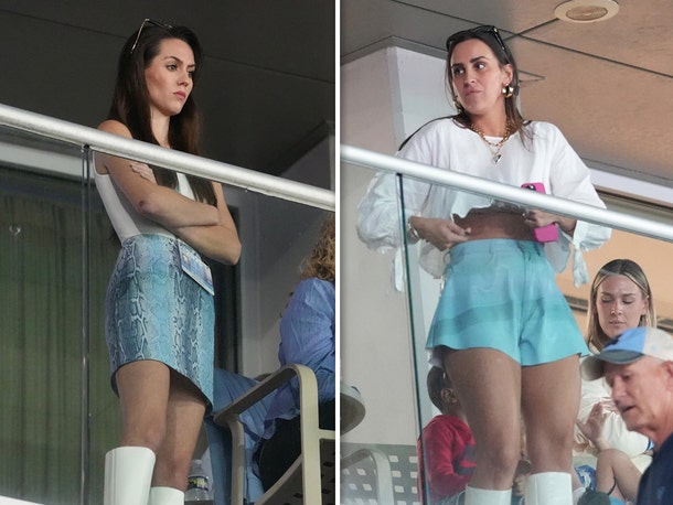 Check out the pics … Jordon, 24, stood watching the game with crossed arms in the suite, wearing a white tank top and blue reptile miniskirt.