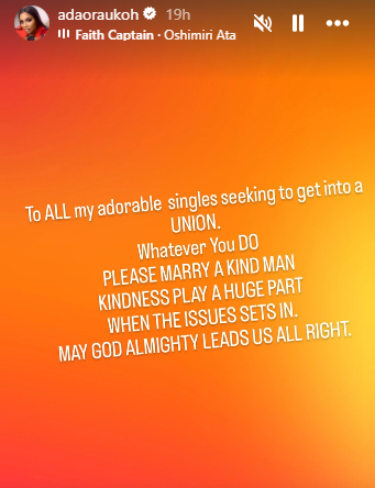 “To all my adorable singles seeking to get into a union. Whatever you do, please marry a kind man. Kindness plays a huge part when issues set in,” she wrote in her Instagram story on Sunday.