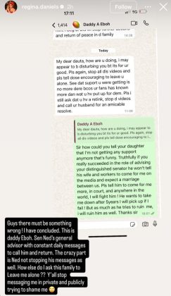 “Guys, there must be something wrong! I have concluded. This is Daddy Eboh, Sen Ned’s general advisor, with constant daily messages to call him and return. The crazy part is Ned not stopping his messages as well. How else do I ask this family to leave me alone? Y’all stop messaging me in private and publicly trying to shame me.”