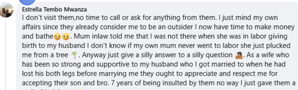 “Anyway just give a silly answer to a silly question. As a wife who has been so strong and supportive to my husband who I got married to when he had lost his both legs before marrying me, they ought to appreciate and respect me for accepting their son and bro. 7 years of being insulted by them, no way I just gave them a wall of Jericho.”