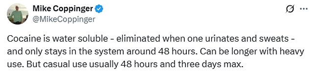 ‘Cocaine is water soluble – eliminated when one urinates and sweats – and only stays in the system around 48 hours,’ the expert tweeted. ‘Can be longer with heavy use. But casual use usually 48 hours and three days max.’