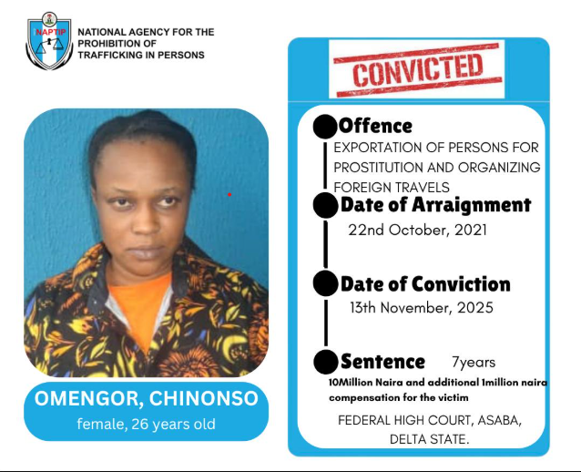 The National Agency for the Prohibition of Trafficking in Persons (NAPTIP) has secured a seven-year conviction of a 26-year-old woman, Chinonso Omengor, who specialised in the exportation of persons for prostitution and organising foreign travels that promote prostitution.