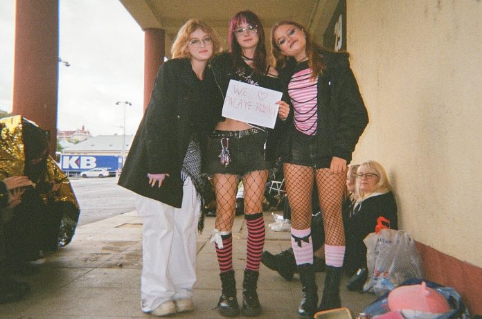 One person is seen listening to Palaye Royale on their phone in one image, while others hold up signs to declare their love for the group in more pictures, and fans eagerly await the band taking to the stage.