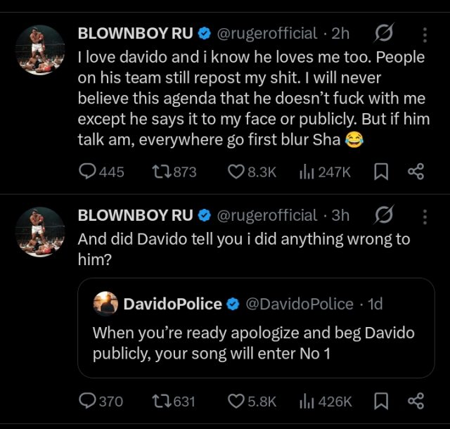 The exchange began when a Davido fan page mocked Ruger with the message: