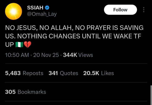 “NO JESUS, NO ALLAH, NO PRAYER IS SAVING US. NOTHING CHANGES UNTIL WE WAKE TF UP 🇳🇬💔”
