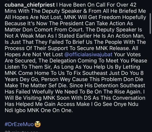 “I will be visiting MNK soon with DS as this conversation has helped me gain access. Make I go see Onye Ndu Ndi Igbo MNK one on one.”