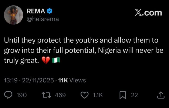 Rema has added his voice to the growing frustration over the rise in terrorist attacks across Nigeria, saying the country cannot move forward if its young people remain unprotected and unsupported.