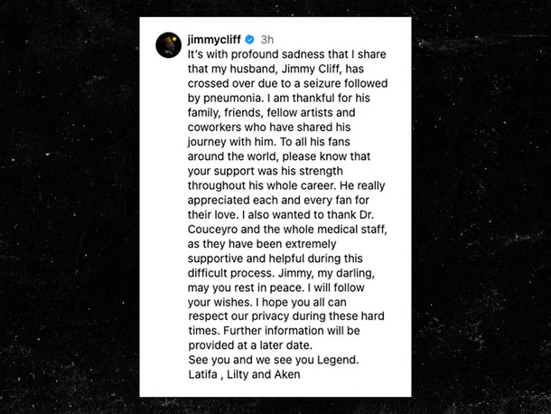 Latifa wrote … “It’s with profound sadness that I share that my husband, Jimmy Cliff, has crossed over due to a seizure followed by pneumonia. I am thankful for his family, friends, fellow artists and coworkers who have shared his journey with him,”