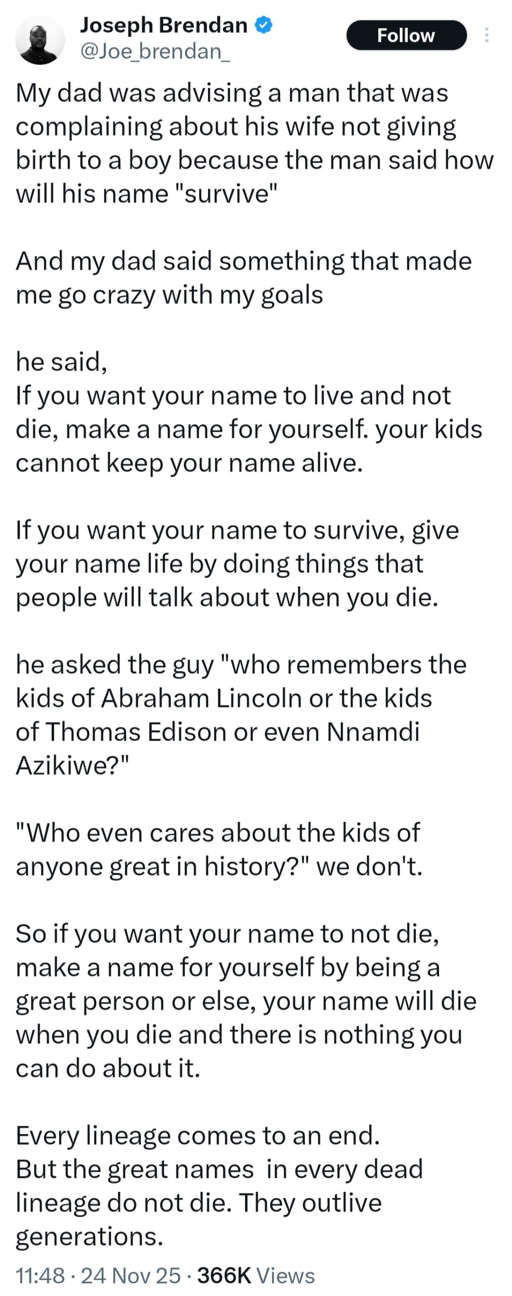 However, the X user said his father told the man that the only person who can keep a man’s name alive is the man himself.