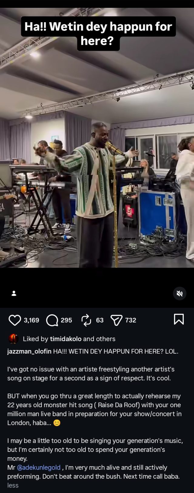 Veteran musician Jazzman Olofin has called out Adekunle Gold for the alleged use of his classic hit “Raise Da Roof” during a London concert