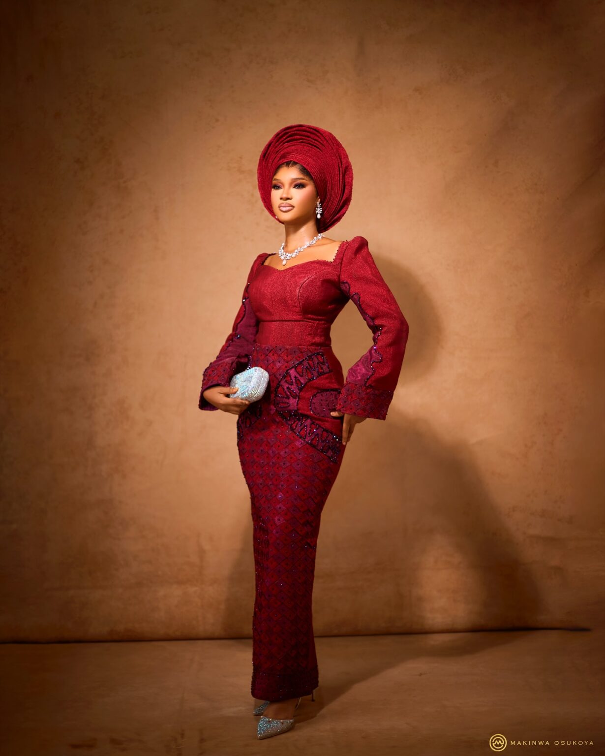 Perfectly designed by The House of Temmy, this red asooke look is a complete stunner from head to toe. The beautifully structured dress features a sweetheart neckline, slightly puffy shoulder sleeves and beaded checker detailing on the skirt — all in all, a true vision of cultural elegance. A Yoruba bride and her gele are like two peas in a pod, and Temmy’s Gele understood the assignment with this well-pleated gele, very sharp and classy. Adding a striking touch to the look is this bold, glowy makeup by Glam by Temi, ultimately tying the regal ensemble together. Your stylish bridal dreams are within your reach with this beautiful look at the top of your list, so go for it!