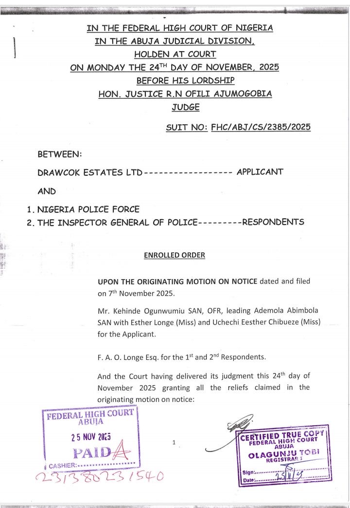 Drawcok Estates LTD had on November 7, 2025 through Mr. Kehinde Ogunwumiu, SAN, Ademola Abimbola, SAN with Esther Longe and Uchechi Chibueze prayed to the court to order the Nigerian Police Force and the IGP who are the first and second respondents not to interfere with or impend or violate her (applicant) right to own the properties on No. 4 Nyasa close, plot 19, Off Ontaria crescent /Mississippi road, Maitama Abuja and 41/42 Akin Adesola Street, Victoria Island, Lagos State as guarantees by the chapter 4 of the Constitution of the Federal Republic of Nigeria 1999 as amended as it only relates to the complaint litigated in the suit.