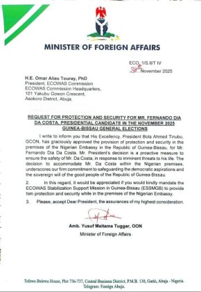 In a letter to Omar Touray, President of the ECOWAS Commission, Nigeria’s Foreign Minister Yusuf Tuggar confirmed that President Bola Tinubu had approved protection for da Costa within the Nigerian embassy in Guinea-Bissau. The letter, dated November 30, also requested that the ECOWAS Stabilization Support Mission in Guinea-Bissau (ESSMGB) provide security for da Costa while on embassy grounds.
