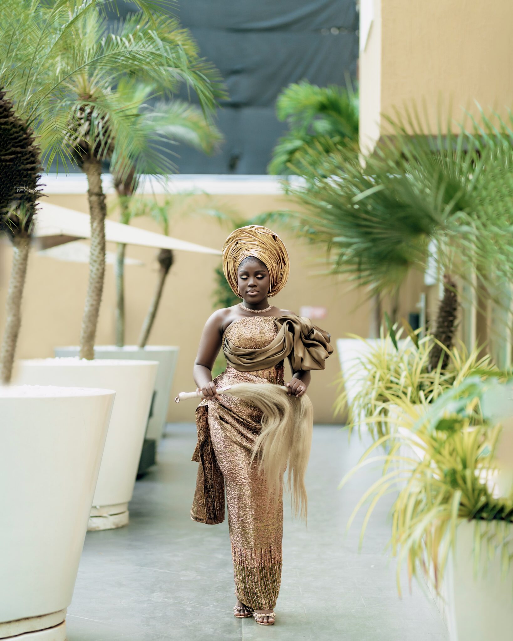 This golden outfit by Esmadelle will have you shining as you strut into your wedding venue. The damask fabric gives the look an instant glow, with the beadings, shoulder structure and draped skirt adding more glamour. With this ensemble, all that glitters is truly gold! The makeup? Chef’s kiss, gorgeously executed by Pearl by Beauty E, we are smitten by the radiance. Mo Oni Gele, then stepped in with this beautiful gele, pleated to perfection and adding that rich cultural touch. If your big day is approaching and you want to be the bride that everyone unmistakably notices, this look will definitely announce you even before you walk in.