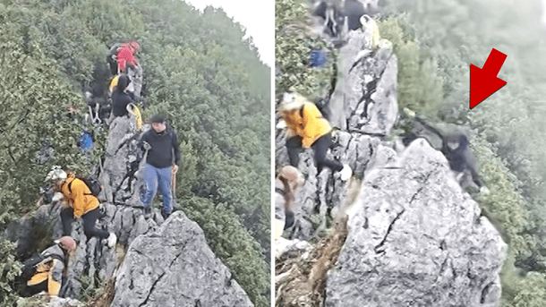 Footage shows the moment the hiking tourist goes over the edge of Huaying Mountain in Guang’an, China.