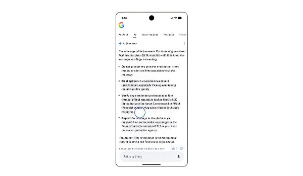 When you receive suspicious texts, emails, or social media messages that ring alarm bells, you can verify the message with Circle to Search by drawing a loop around the text block. It carries out a search that consults information from across the web. The results will be seen in an AI Overview at the top of the screen. The summary will include online data, such as reports of similar scams, known fraudulent tactics, or warnings from official sources, to determine whether the message is malicious.