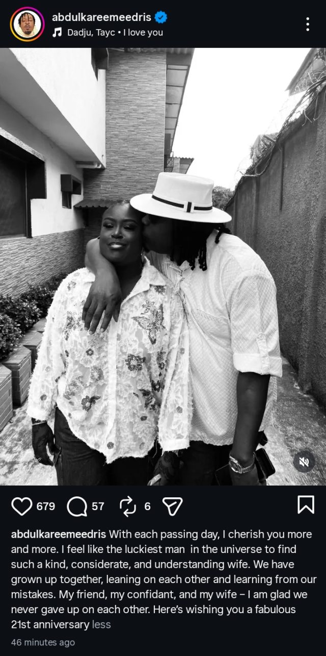 Music legend Eedris Abdulkareem is celebrating a remarkable milestone, marking 21 years of marriage with his wife, Yetunde