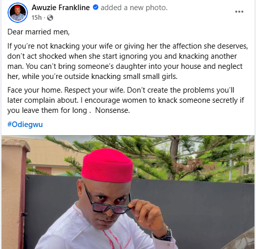 “Dear married men, If you’re not knacking your wife or giving her the affection she deserves, don’t act shocked when she start ignoring you and knacking another man. You can’t bring someone’s daughter into your house and neglect her, while you’re outside knacking small small girls. Face your home. Respect your wife. Don’t create the problems you’ll later complain about. I encourage women to knack someone secretly if you leave them for long . Nonsense.”