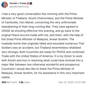 Thailand vows to keep fighting Cambodia, hours after Trump’s ceasefire call