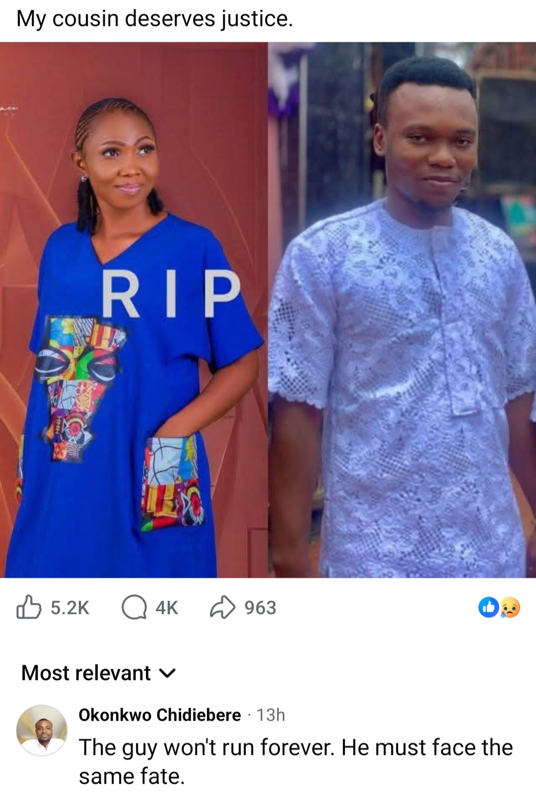 Angela stated that “Ogechukwu deserves justice” and called on well-meaning Nigerians to help locate the fleeing fiancé and report to the nearest police station if they have information on his whereabouts.