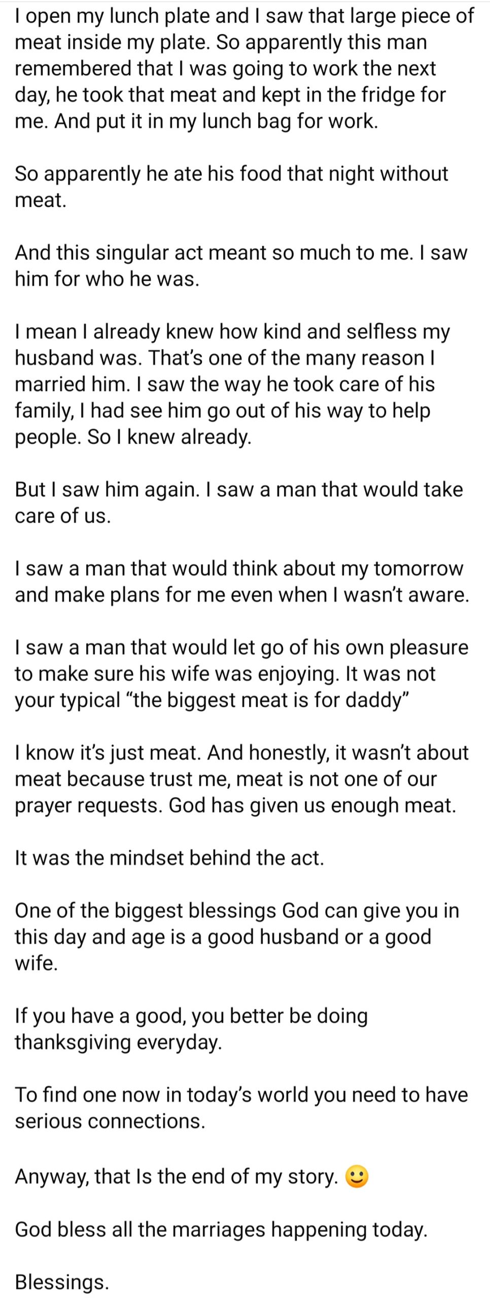 “When I checked the pot, the small meat was left there. I just smiled because I was like ‘so this man likes meat like me and took the bigger one’.