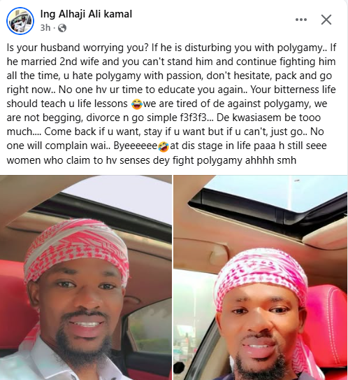 “Is your husband worrying you? If he is disturbing you with polygamy.. If he married 2nd wife and you can’t stand him and continue fighting him all the time, u hate polygamy with passion, don’t hesitate, pack and go right now.. No one hv ur time to educate you again.. Your bitterness life should teach u life lessons, we are tired of de against polygamy, we are not begging, divorce n go simple … De kwasiasem be tooo much…. Come back if u want, stay if u want but if u can’t, just go.. No one will complain wai.. Byeeeeee. At dis stage in life paaa h still see women who claim to hv senses dey fight polygamy ahhhh smh,” he wrote.