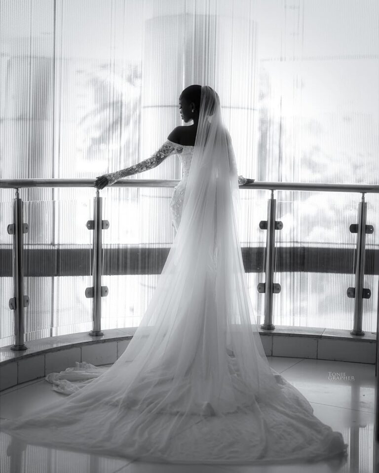 We are loving this dress by Designs by Lezie, and you might as well! The off-shoulder sleeves, floral lace fabric and the tulle veil come together beautifully in achieving this ethereal ensemble.  Dinma Dream, living up to their name, came through perfectly, not just once but twice, with this dreamy, makeup glam and the expertly sleeked hairdo. This look is a stunning reflection of timeless elegance. If you are yet to decide on a look for your big day, this might just be it!