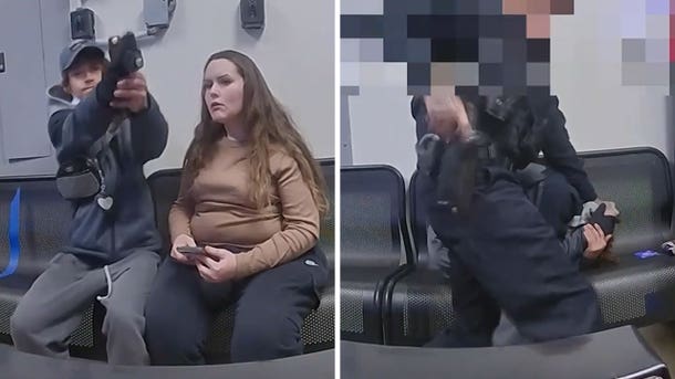 Then, all hell breaks loose. The store’s loss prevention specialist dives on Newman, knocking the gun out of his hands, before the officer rushes in with a crushing knee to Newman’s midsection. Newman is then quickly wrestled to the ground.