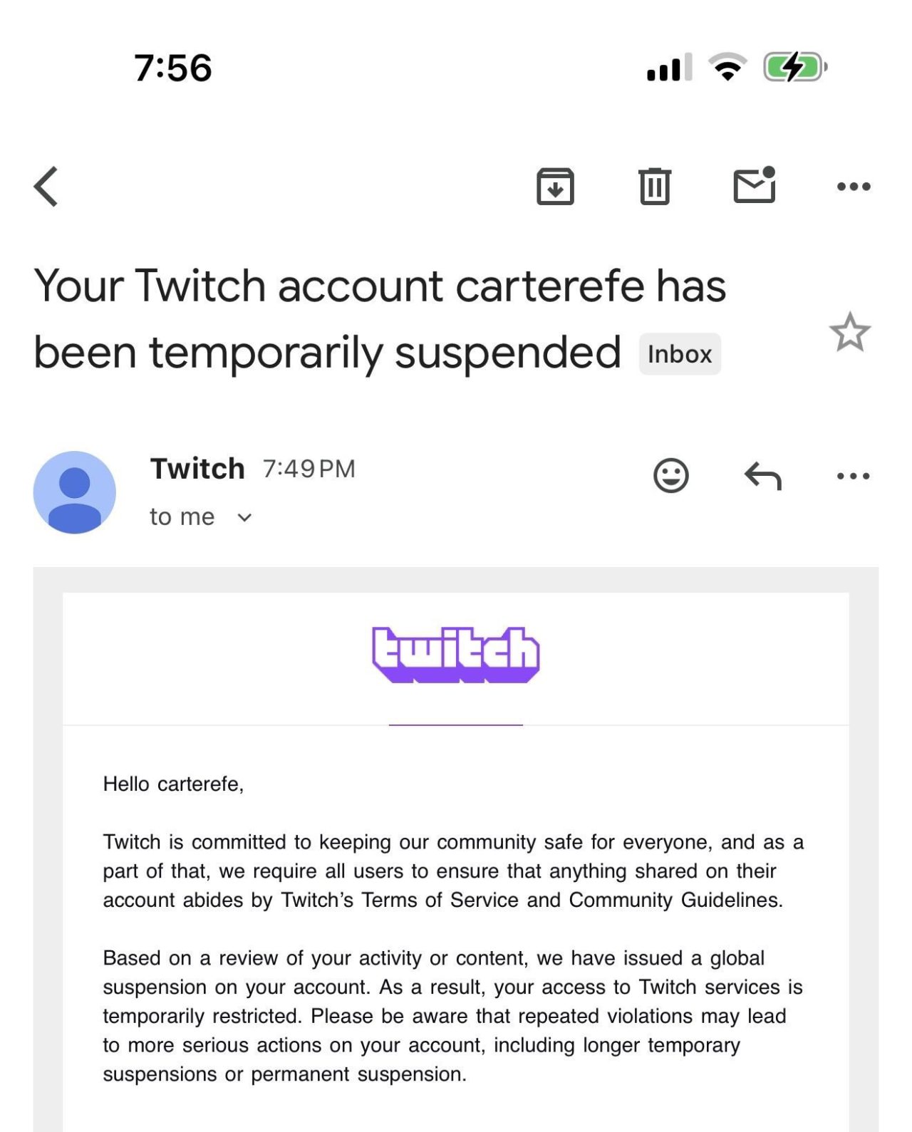 The content creator shared a screenshot of the notification on his X account, showing Twitch’s message titled “Your Twitch account carterefe has been temporarily suspended.” The email stated that Twitch is committed to keeping the community safe and requires all users to comply with its Terms of Service and Community Guidelines.