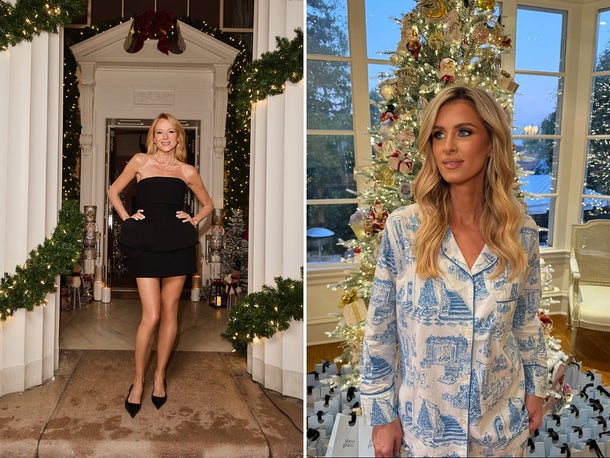 While Jewel got all gussied up in Jimmy Choo shoes and a little black dress by Magda Butrym, Nicky Hilton got comfy in pajamas in front of a whole lot of presents.