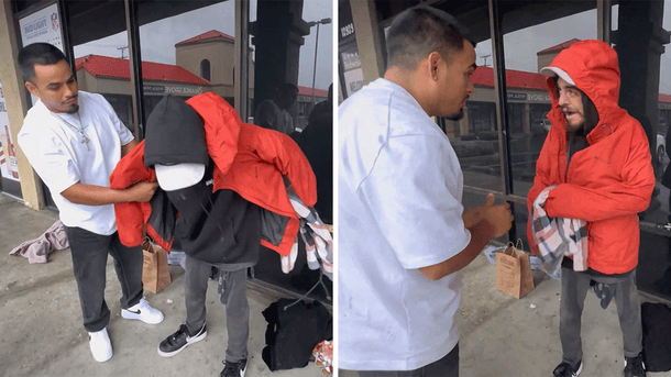 One of the men prays over Tylor after giving him a jacket to keep him protected from the torrential downpour beating down on Southern California.