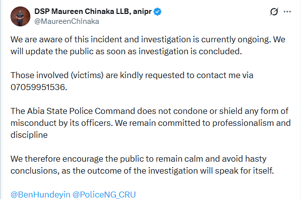 Also reacting, the spokesperson of the Abia state police command, DSP Maureen Chinaka, wrote