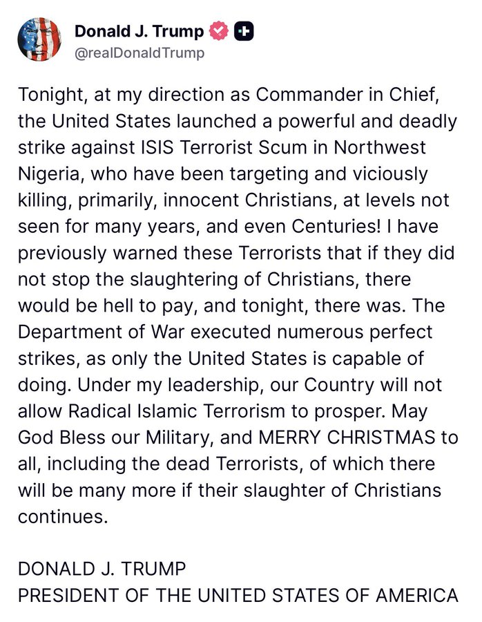 “Tonight, at my direction as Commander in Chief, the United States launched a powerful and deadly strike against ISIS Terrorist Scum in Northwest Nigeria, who have been targeting and viciously killing, primarily, innocent Christians, at levels not seen for many years, and even Centuries!” the president wrote on Truth Social.