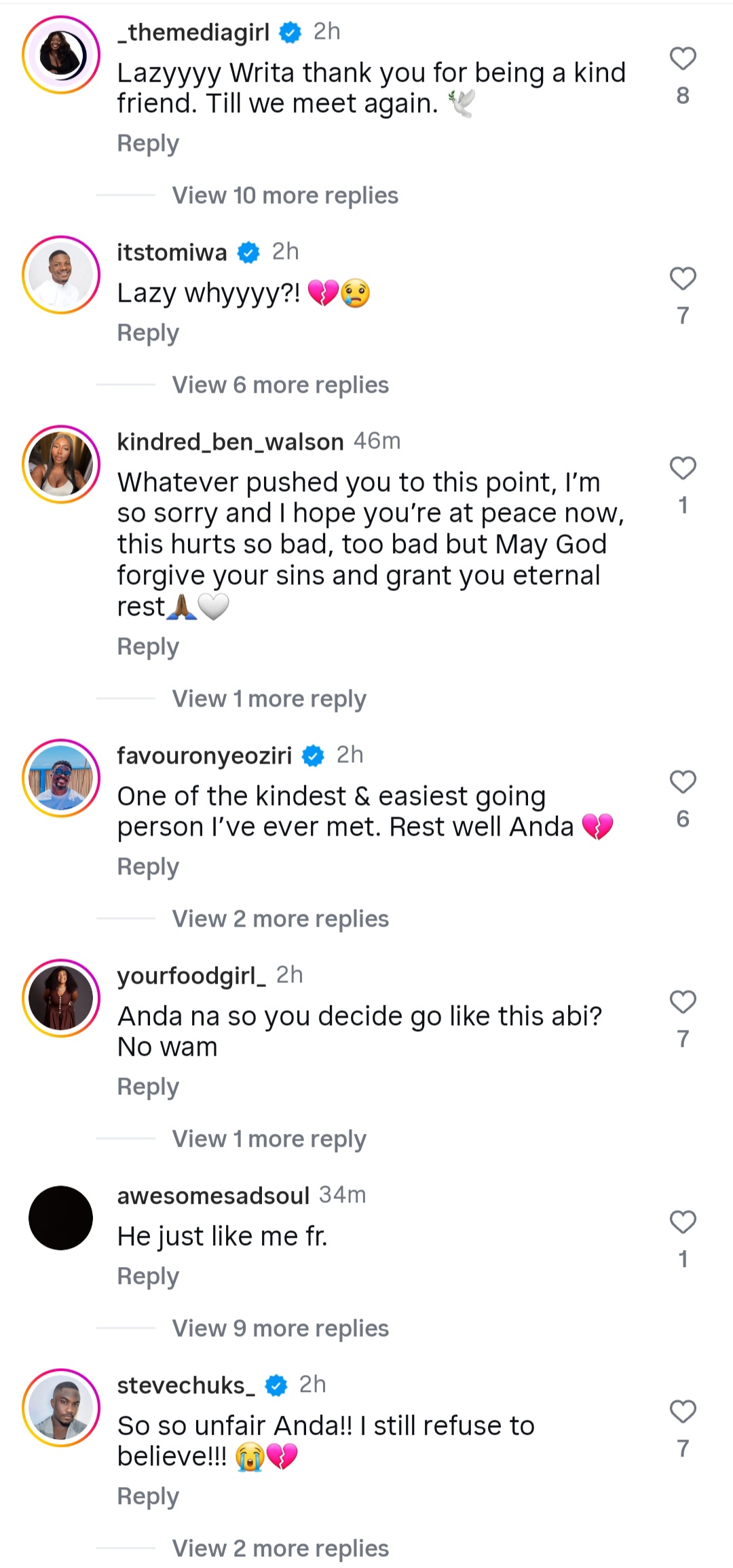 Anderson’s last post reads: “Don’t cry for me please o… I lived a full and adventurous life, people who know me can testify, I just don’t have the energy to continue anymore.
